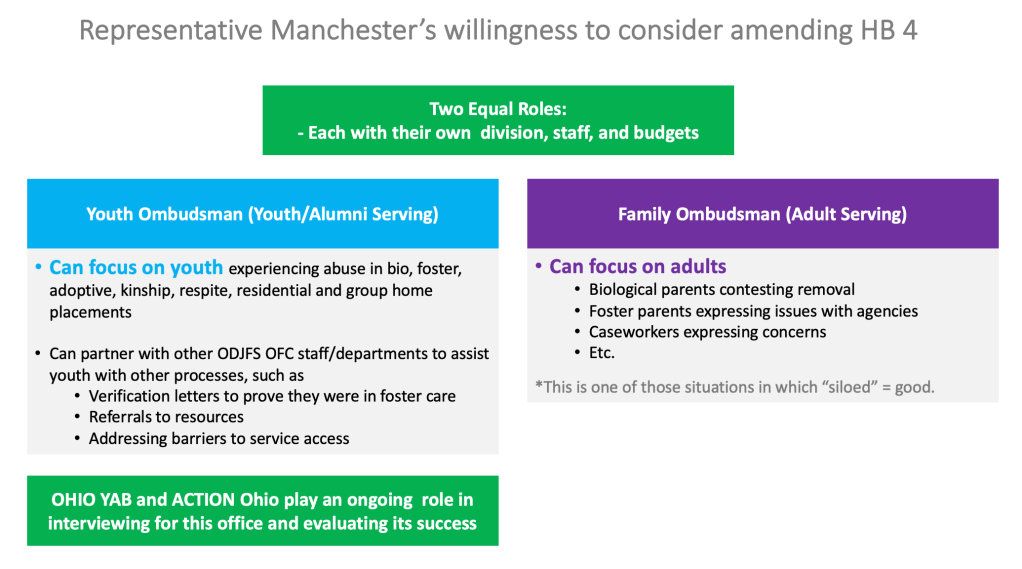 HB 4, which recently passed in the Ohio House of Representatives, includes language regarding an ombudsman office related to child welfare, but it does not currently reflect what Ohio youth have asked for… The language on the left, in blue, reflects what youth have requested: