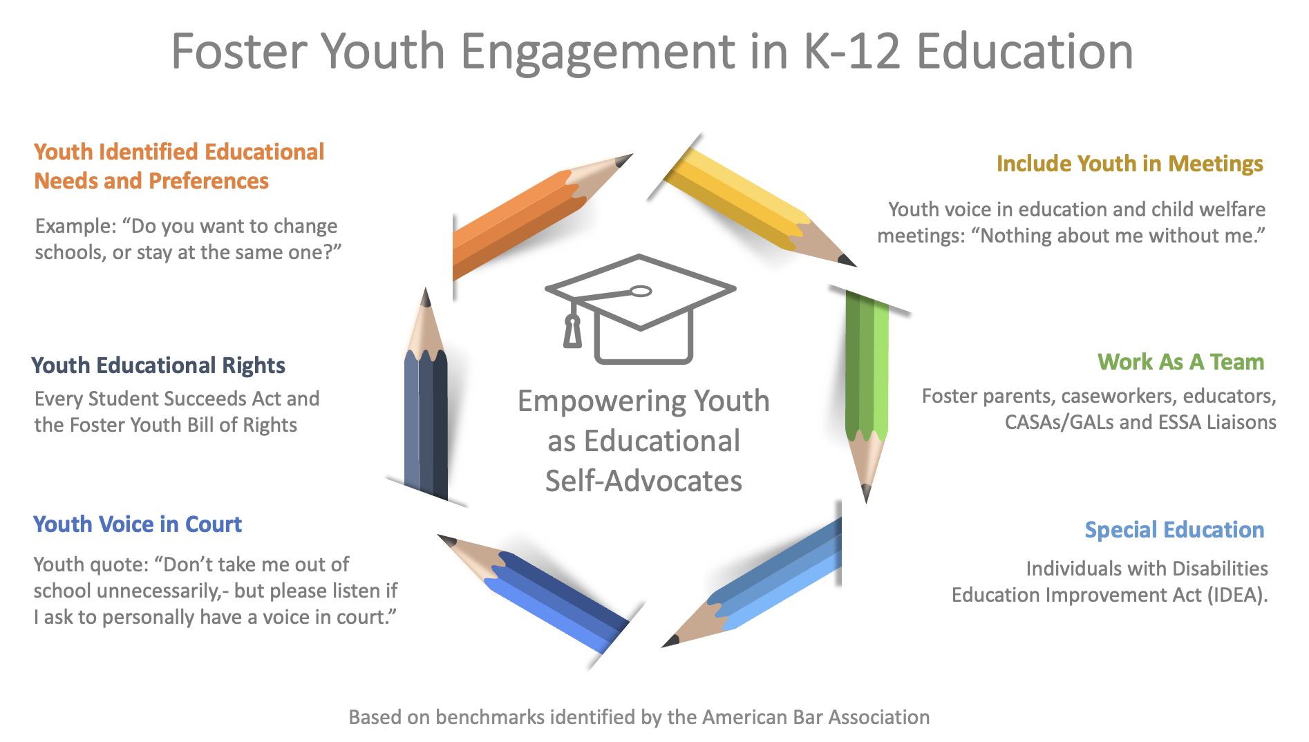 The American Bar Association has published a list of benchmarks related to informing and empowering foster youth to be self-advocates regarding their education.