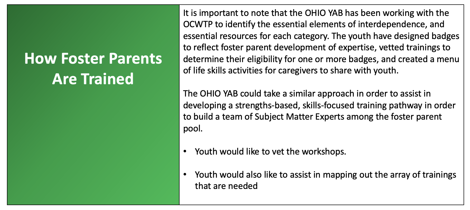 3.) Training Foster Parents to Help Youth Develop Coping Skills: The OHIO YAB would love to work on this project. It would be similar to their current work on the Life Skills pathway. They believe this approach would help to identify and build Subject Matter Experts among foster parents. Training badges could reflect foster parent comfort and expertise with supporting, empowering and preparing specific youth populations, such as foster youth who are teen parents.