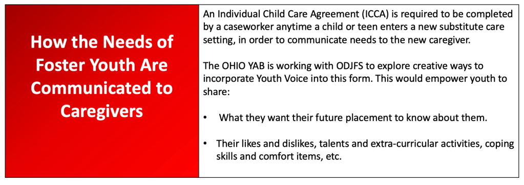 1.) Transforming the ICCA Form: The OHIO YAB greatly appreciates ODJFS being willing to participate in ongoing conversations about how to improve the ICCA form. Historically, youth have expressed concerns that the ICCA form is not strengths-based and can be an impediment to finding a placement. Details that would be helpful to support the success of placements include: (a.) context, (b.) triggers, (c.) coping strategies.