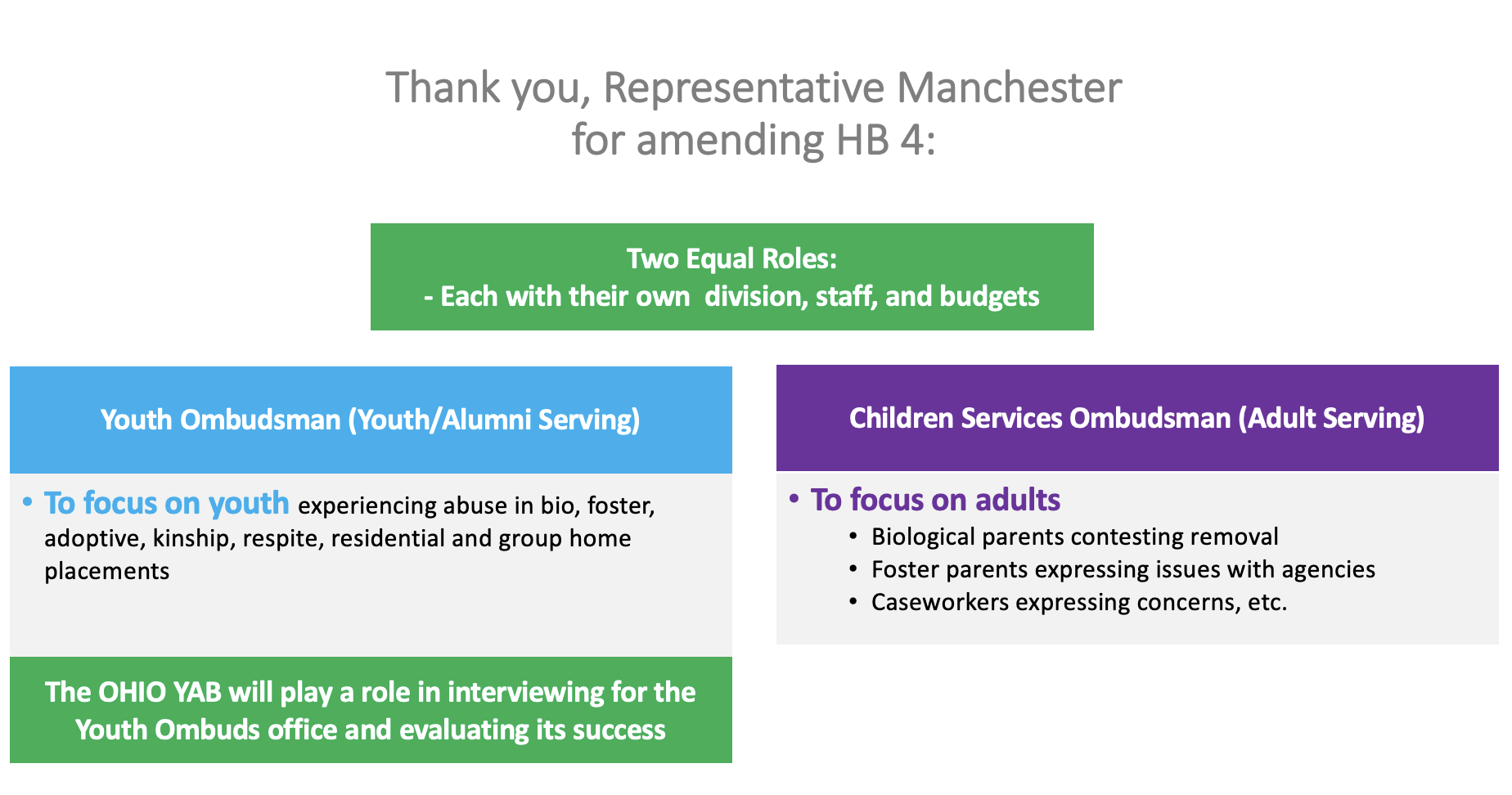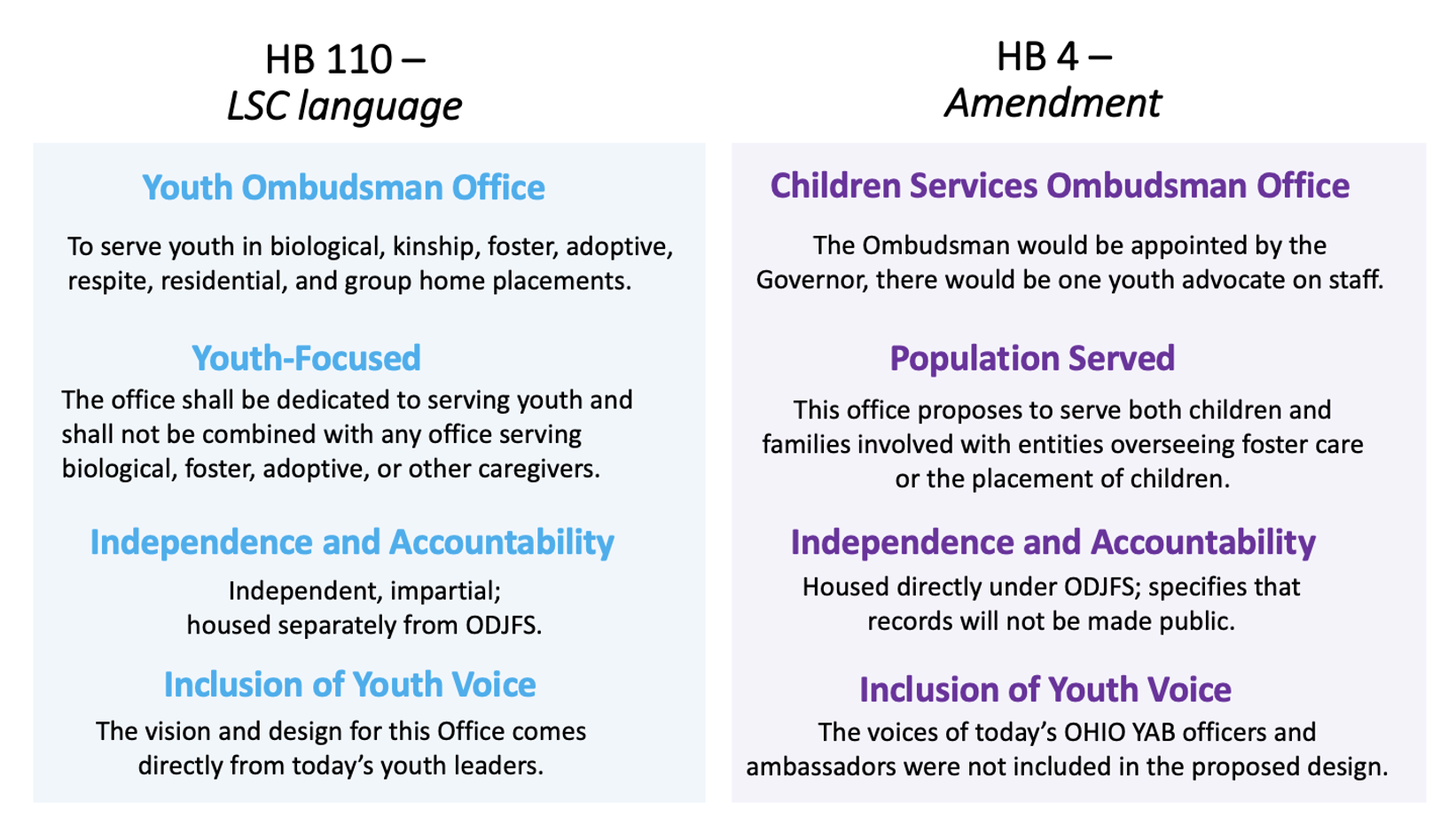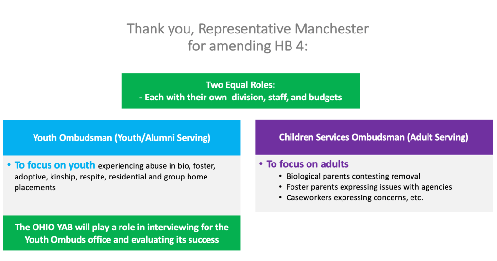 When an amendment was added to House Bill 4 to establish a Children Services Ombudsman Office, we reached out to ask that revisions be made. The language on the left, in blue, reflects what youth requested: